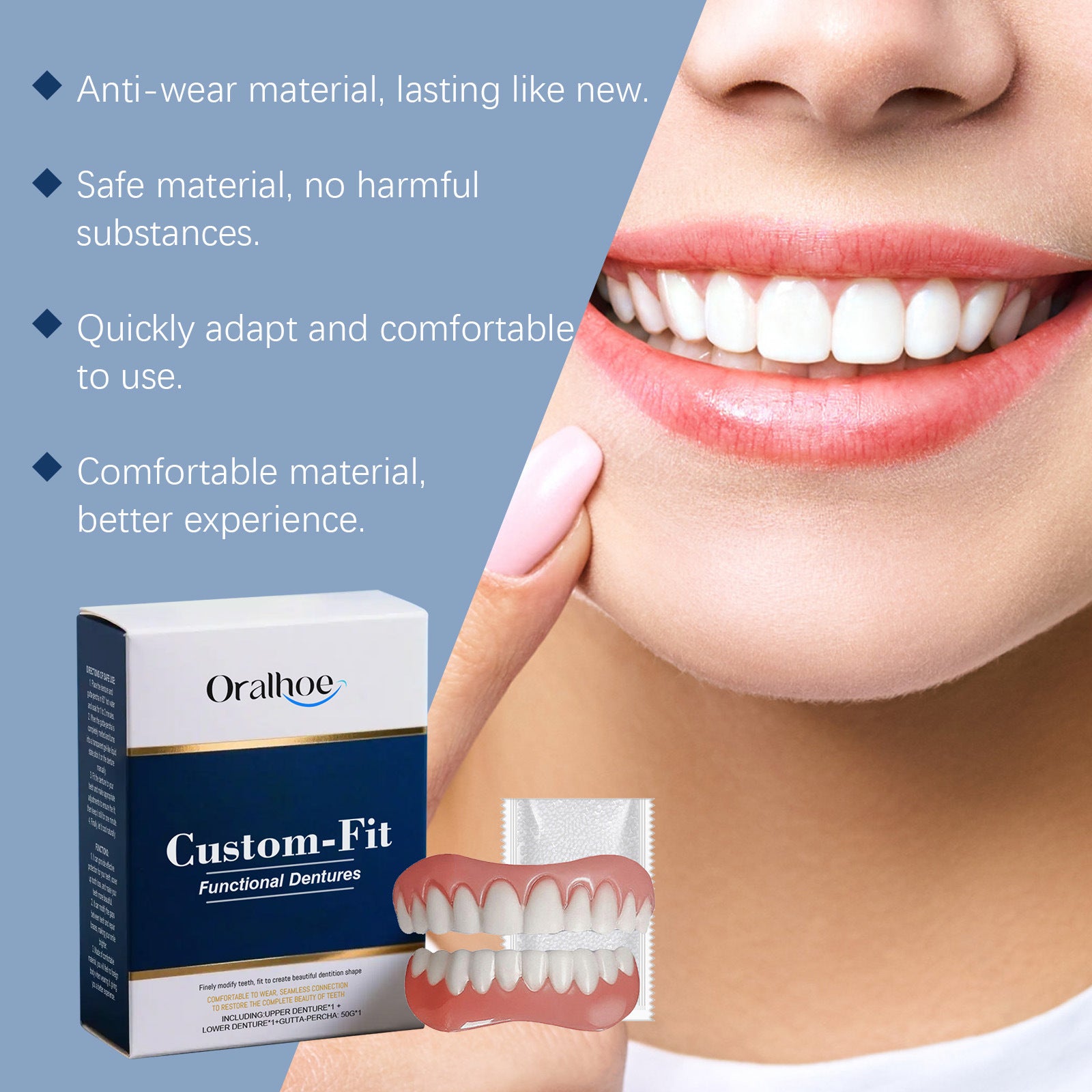 It molded so easily to my gums, and now it fits like it was made just for me. I don’t even need adhesive anymore. No slipping, no soreness—just comfort and the confidence to smile again."
